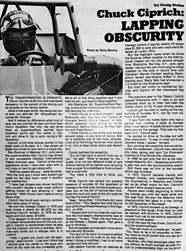 Chuck enjoyed a long (around 25 years) successful racing career, mostly spent in supermodifieds and modifieds, and mainly being based in the North East. Chuck did particularly well at Oswego Speedway. Chuck also used to be an electrician for the Conrail railroad operation in the New York area, where he remained until his latter years, moving down to Sun City Center, Florida. He also served in the US Army.