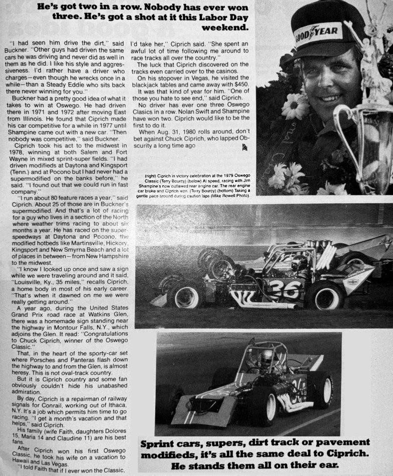 Chuck Ciprich drove a real smooth consistent 200 laps to defend his Classic Championship victory in 1979 but once again it was not the favorite that won the race. 1979 was the year of 'team 8 balls' - the roadster driven by Jim Shampine and Shampine's rear engine creation driven by Warren Coniam.