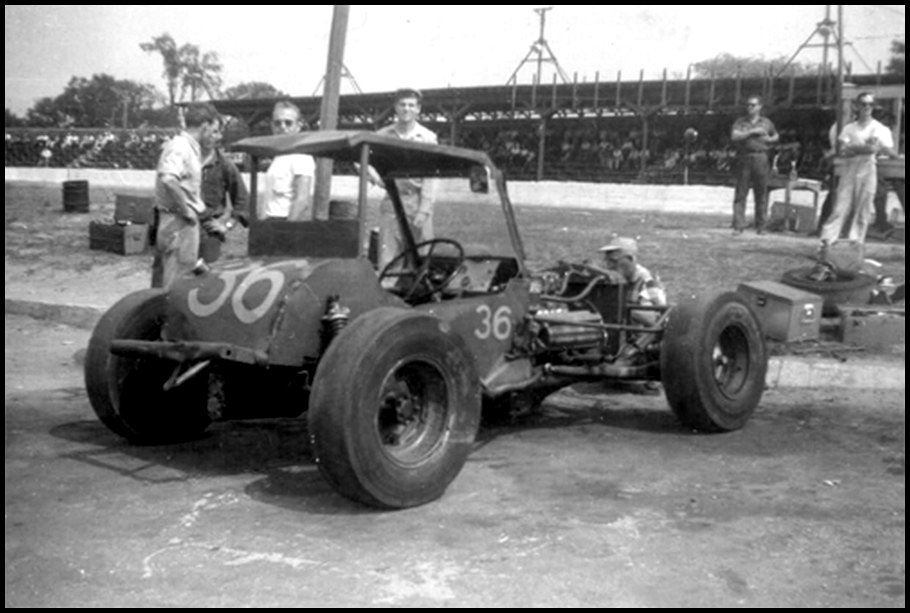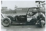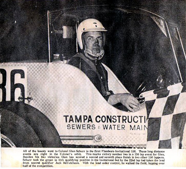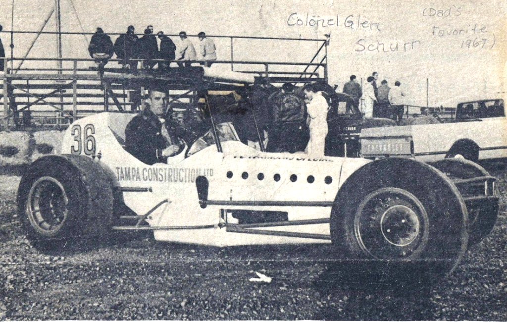 Here's a pic (below) of Glenn Schurr taken at Flamboro Speedway in 1967, the last year that supermodifieds ran regularly at Flamboro. 1967 was also the first year that my father starting taking my brother and I to see supermodifieds. We used to cut pictures out of programs and put them in a scrapbook, which I still have.